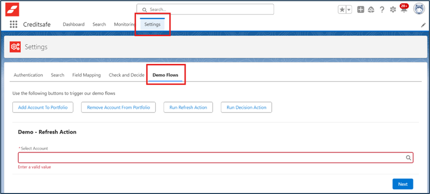 Go into your settings in Salesforce, then click on “Demo Flows”. From here you can test the pre-built flows that Creditsafe have as standard. This can advise if there’s an issue with the Creditsafe action or if the issue lies somewhere else within your flow.