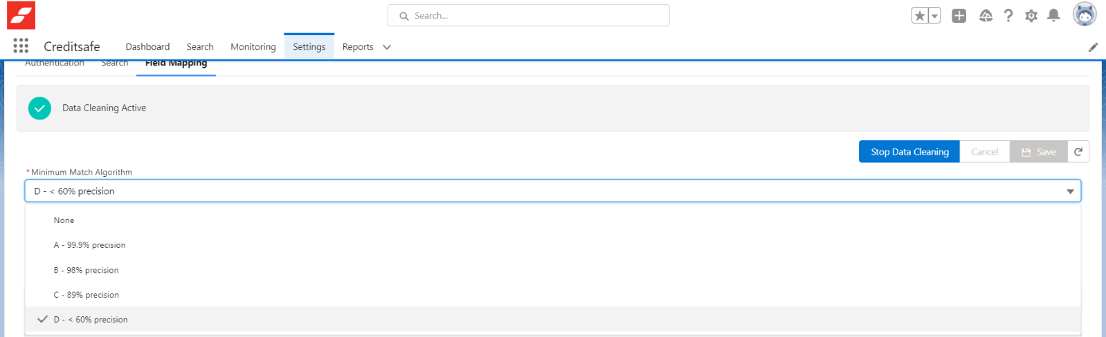 Als u gegevensopschoning Data Cleaning hebt ingeschakeld en u ziet geen bijgewerkte records, controleer dan het matchingalgoritme in de instellingen. We hebben patronen die variëren van sterke exacte overeenkomsten tot losse overeenkomsten, omdat we begrijpen dat klanten verschillende gebruikssituaties hebben. Mogelijk moet u het matchingalgoritme naar een lagere categorie verlagen.