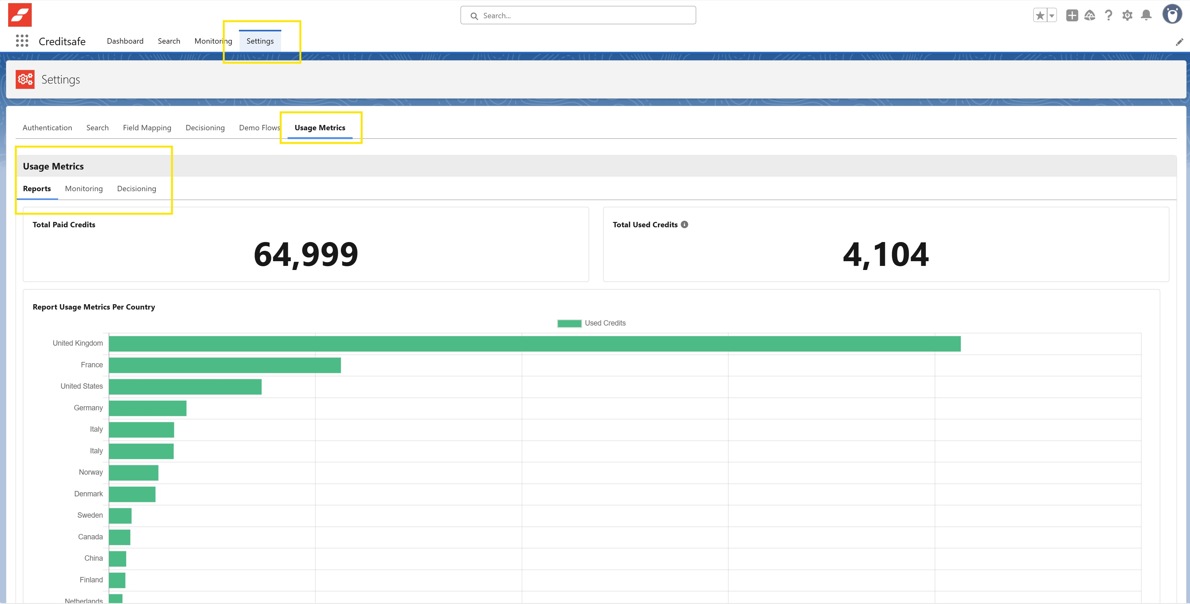- U krijgt een dashboard te zien met een overzicht van uw beschikbare credits, gebruikte credits en een uitsplitsing hiervan per land.