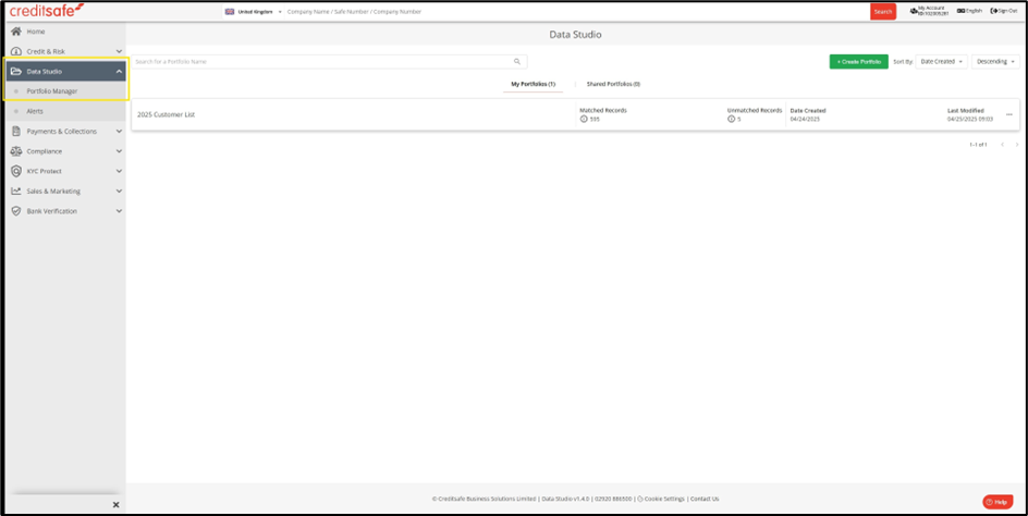 Portfolio's zijn toegankelijk via het menu aan de linkerkant door te klikken op Data Studio > Portfolio Manager. Zodra u hierop klikt, wordt u dir ect naar uw portfoliolijst geleid.